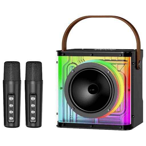 این اسپیکر علاوه بر صدای پرقدرت و نورپردازی LED رنگی، با داشتن دو میکروفون تجربهای هیجانانگیز برای کارائوکه و خوانندگی به شما میدهد. پشتیبانی از بلوتوث، فلش USB، کارت حافظه و کابل AUX باعث میشود همیشه راهی برای پخش موسیقی داشته باشید.
