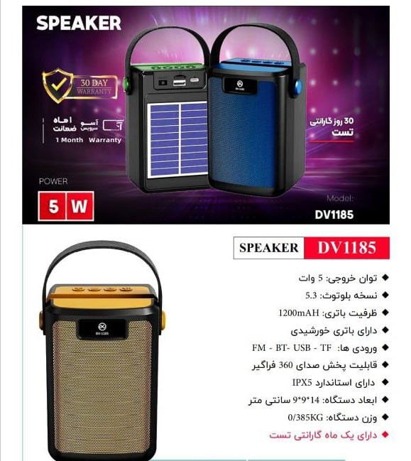 اسپیکر شارژی و خورشیدی DV1185 | قابل‌حمل، قدرتمند و مجهز به پنل خورشیدی و بلوتوث